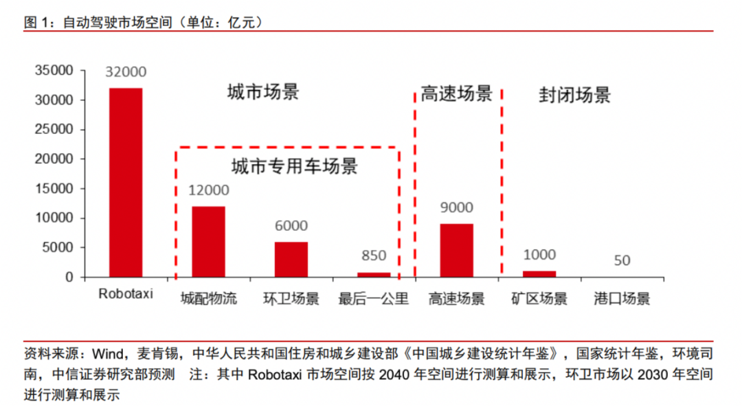 与之对比,据中信证券预测,到2040年Robotaxi的潜在市场空间约为3.2万亿元,而自动驾驶技术在环卫、物流配送、港口矿区运输等其他领域的市场空间约为3万亿元。
