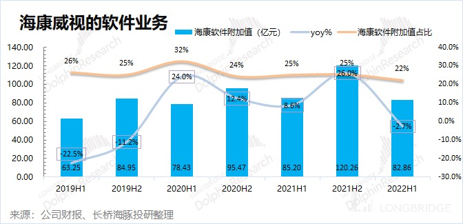 海豚君通过估算 2022 年上半年海康威视的软件端业务收入为 82.86 亿元,同比下滑 2.7%。上半年海康威视软件附加值,在公司总收入的比重为 22%,在疫情和经济增速下滑的影响下,公司的软件服务收入出现下滑,占比也出现下滑。