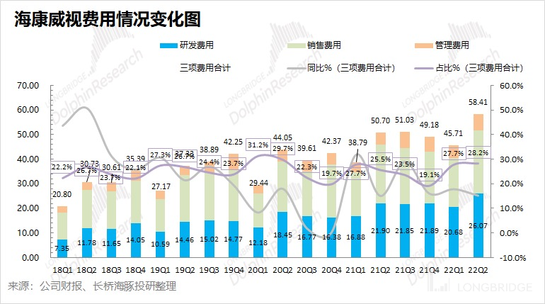 海康威视的核心费用情况主要有销售费用、管理费用和研发费用。海康威视 2022 年第二季度三项核心费用合计 58.41 亿元,同比增长 15.2%。三项核心费用率达到 28.2%。**海康威视本季度的费用端再创新高,三项费用率也有明显抬升**。