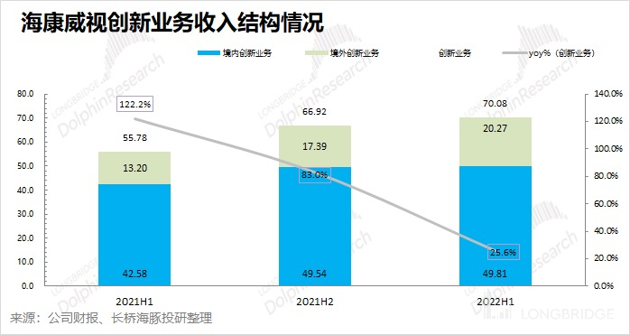 **在境内的创新业务中,海康威视 2022 年上半年实现营收 49.81 亿元,同比增长 17%**。从营收体量看,创新业务目前仍集中在境内业务为主。