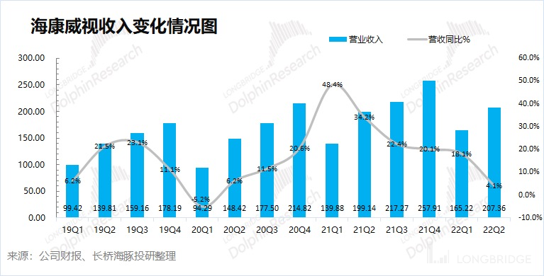 海康威视在 2022 年第二季度实现营收 207 亿元,同比增长 4.1%,低于市场预期(227.75 亿元)。虽然海康二季度的营收较一季度仍保持增长,但的增速从过去两位数骤降至本季度的 4%。海豚君认为公司二季度增速下滑主要受国内疫情等因素的影响,随着疫情影响的褪去,公司在下半年的增速有望回暖。