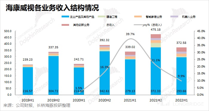 海康威视的主业产品及服务业务在 2022 年上半年实现营收 302.5 亿元,同比增长 6.8%。上半年疫情等不稳定因素再度来袭,使得公司主业的增速从去年同期的 30%+ 骤降至个位数增长。由于国内疫情的出现,上半年主业的增长主要来自于境外主业收入的增长。