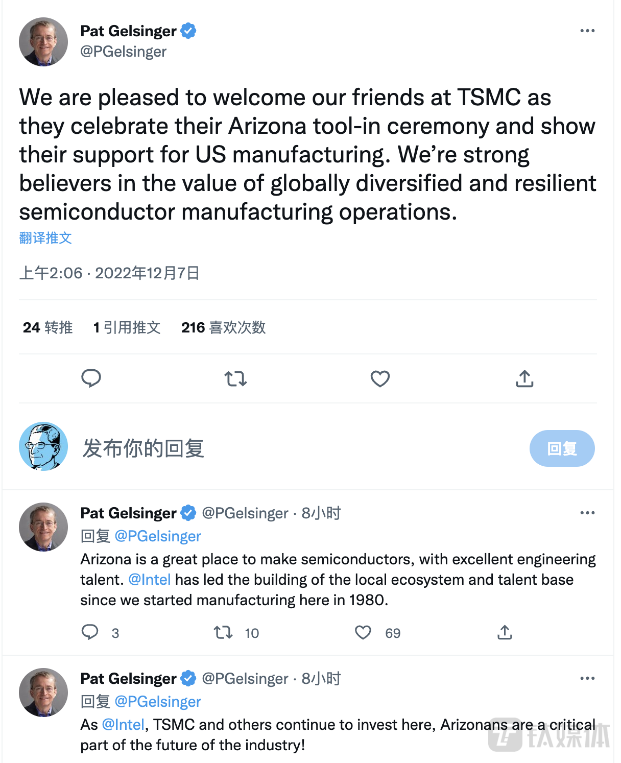 有趣的是,在北京时间今天凌晨,台积电的竞争对手、也是最新合作伙伴的英特尔CEO基辛格(Pat Gelsinger)在台北发布了一条推文,称很高兴欢迎来自台积电的朋友们(到美国)。台积电今天在美国举行首批机台设备到厂庆祝仪式,并展现其对于美国制造的支持;其坚信在全球化之下多样性和富有韧性的布局,可为半导体制造营运所带来的价值。