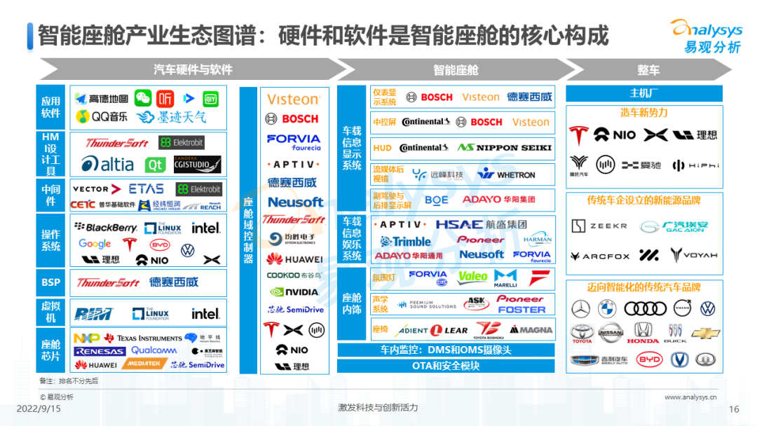 由于实现难度相对较小、成果易感知、可助力用户购车意愿提升,智能座舱或成为汽车智能化趋势下,最先迎来快速发展的方向之一,市场空间十分广阔。具体来看,硬件领域将涌现座舱芯片、域控制器、车载显示屏、HUD等多个增长确定性高的细分市场;软件领域是智能座舱市场新蓝海,汽车产业链未来价值的核心,吸引各类厂商积极布局。