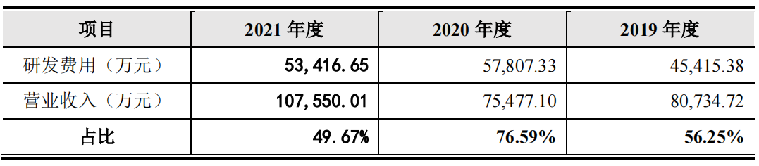 研发投入比高出了科技类公司的正常水平。2019年、2020年和2021年,公司研发费用分别为 4.54亿元、5.78亿元和 5.34亿元,最近三年累计研发投入合计超过15.66亿元;公司最近三年累计研发投入占近三年累计营业收入比例高达59.39%。