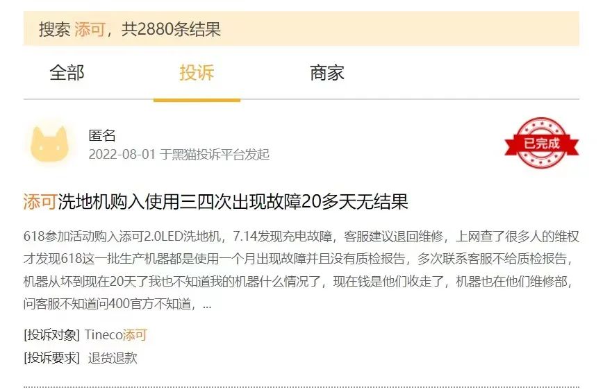 **2.**钱东奇治下,与科沃斯同袍的兄弟添可则屡屡陷入品控问题的争议中去,在黑猫投诉平台上搜索“添可”,共计2880条投诉结果,包括且不限于出厂故障但不予换货、产品二次售卖以及过退货期即坏等情况。