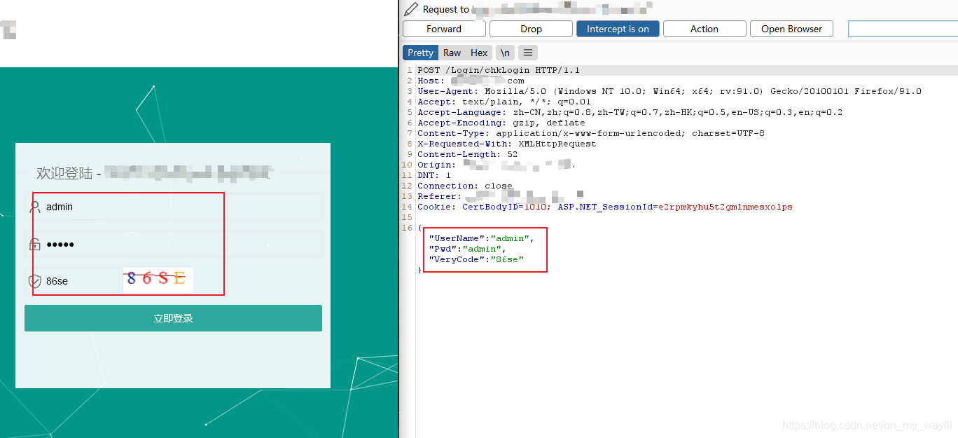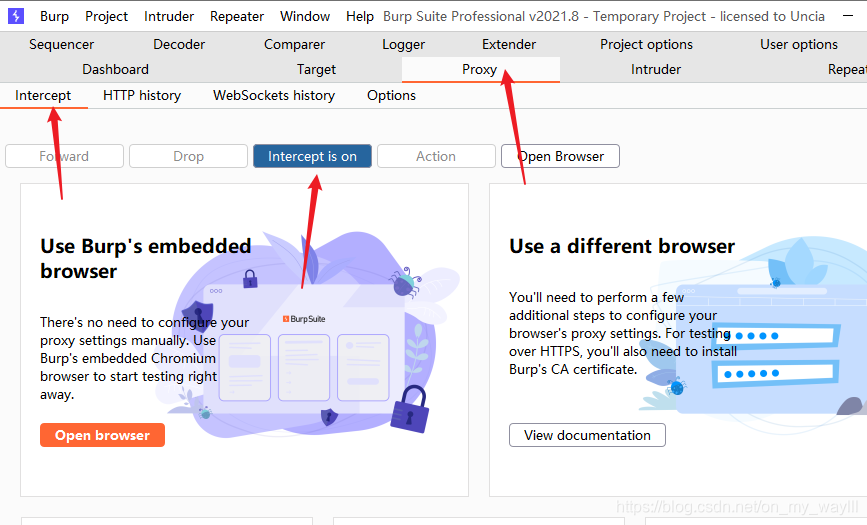 分别在burp中选择proxy、Intercept,然后设置成Intercept is on , burp已经开始拦截了