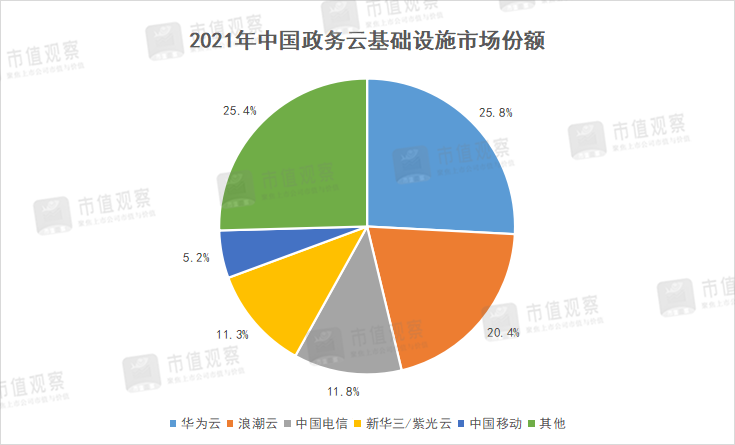 作为云服务行业的重要细分,政务云是除泛互联网领域外的第二大细分市场,而华为云一直保持领头羊地位,据IDC研究,2021年华为云在政务公有云市场占比达25.8%。