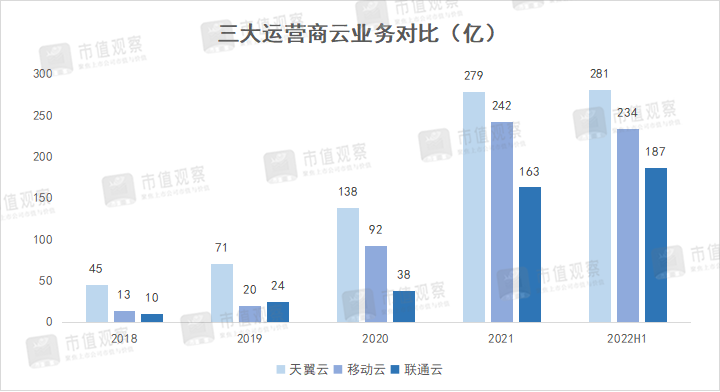 其中天翼云营收规模最大,今年上半年实现营收281亿,同比增长100.8%;移动云收入234亿,同比增长103.6%;联通云收入187亿,同比增长143.2%。