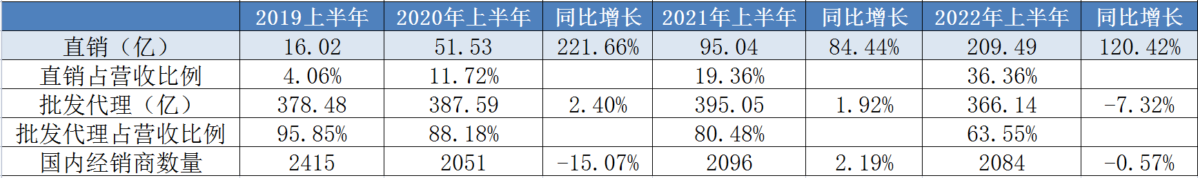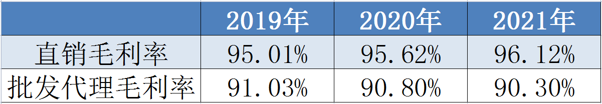 另一方面,与直销渠道营收占比不断提升相比,传统的渠道批发代理比例持续降低,2019年上半年、2020年上半年、2021年上半年批发代理营收仅有小的增长,2022年上半年下滑7.32%;自2019年上半年至去年上半年,批发代理占营收比例分别为95.85%、88.18%、80.48%,今年上半年下滑幅度较大,降至63.55%。代理经销商数量方面,从2019年上半年的2415降至今年上半年的2084家;毛利率方面,直销毛利率2019年、2020年、2021年分别为95.01%、95.62%、96.12%,批发代理毛利率近三年分别为91.03%、90.8%、90.3%。可以看到,直销毛利率不仅一直优于批发代理,还保持了持续增长,而批发代理毛利率在持续下降。