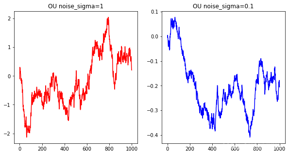 OU noise往往不会高斯噪声一样相邻的两步的值差别那么大,而是会绕着均值依据惯性在上一步附近正向或负向探索一段距离,就像物价和利率的波动一样,这有利于在一个方向上探索。