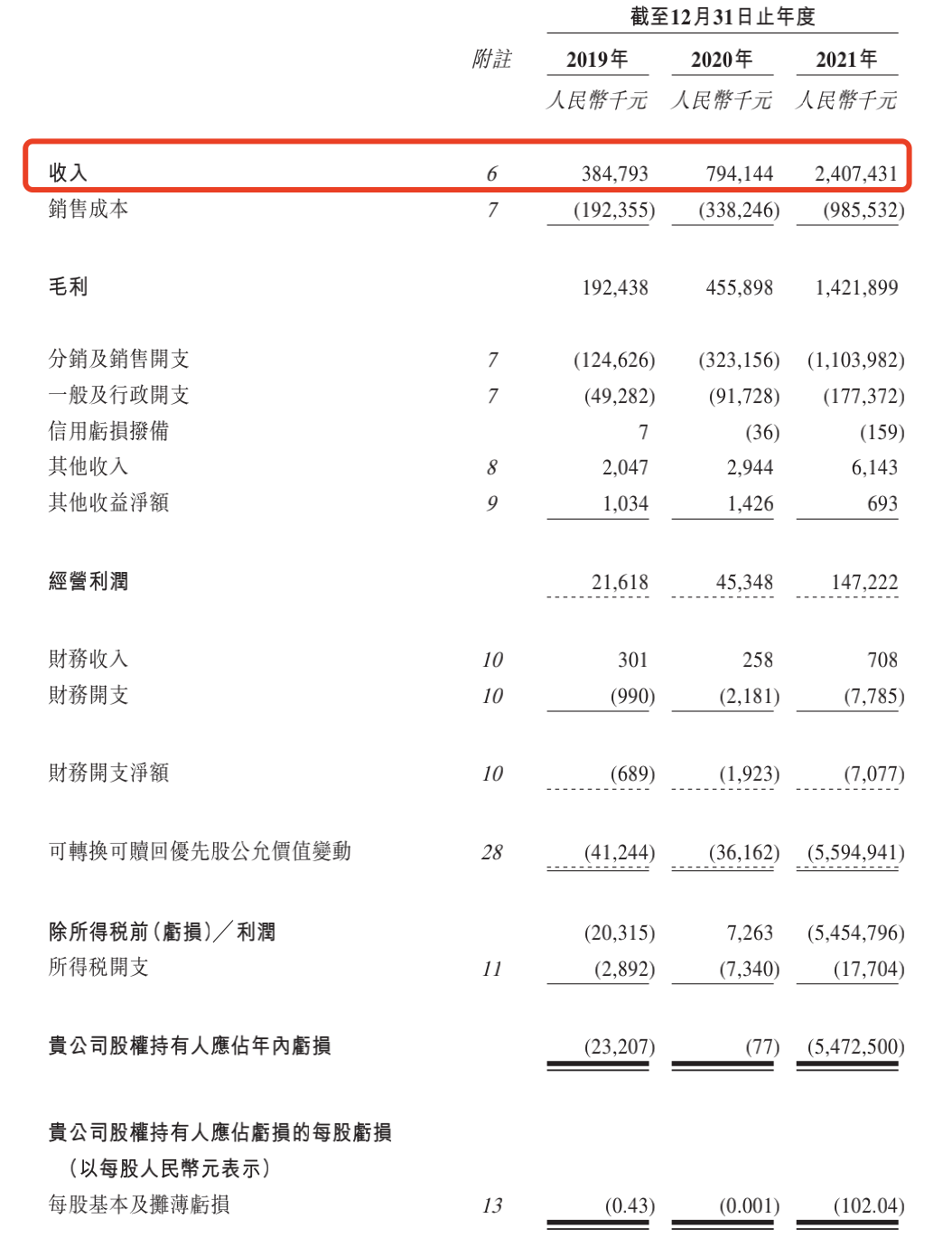 招股书显示,2021年蕉下的营收收入达24.1亿元,同比增长203.1%,毛利率提升至59.1%。而在过去三年,营收翻了五倍:近3年的营收分别为3.85亿元、7.94亿元、24.21亿元,毛利率分别是50.0%、57.4%、59.1%,高于行业平均水平。