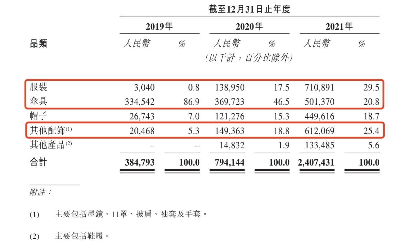 从业绩表现来看,蕉下在销售非防晒产品方面实现了快速增长。非防晒产品收入由2019年的人民币280万元大幅增至2020年的人民币0.765亿元,并进一步增长超过五倍至2021年的人民币4.957亿元,其收入贡献率由2019年的0.7%增至2020年的9.6%,并进一步增至2021年的20.6%。