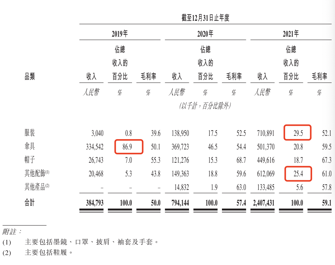在伞具之外,蕉下其他产品线的盈利能力也并不低。尤其是帽子、服饰配饰等产品线,去年甚至达到了60%以上的毛利率。