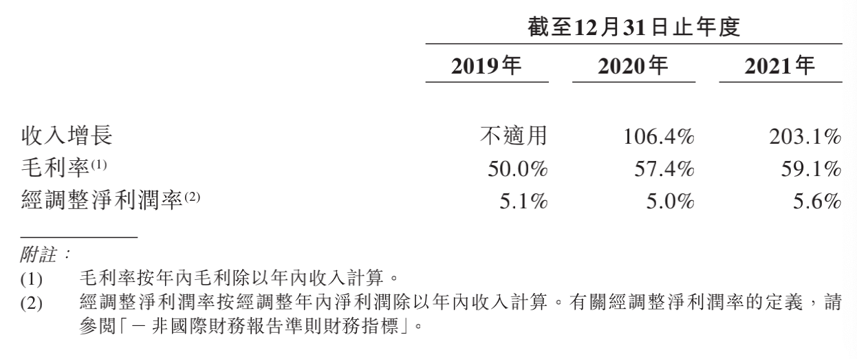 从营收业绩来看,大单品策略和DTC渠道驱动确实带给了蕉下品牌强劲的销售表现。 招股书披露,2019年、2020年、2021年,蕉下的营收分别为3.85亿元、7.94亿元、24.1亿元。同比增长率为103%和203%,年复合增长率为150.1%。 从产品的毛利率处于不断上升的趋势来看。2019年到2021年的毛利率分别为50%、57.4%、59.1%。