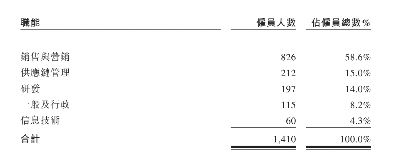 蕉下表示,截至2021年12月31日,研发团队由197名员工组成,目前在中国已拥有123项专利,正申请72项专利,并表示未来计划搭建性能检测实验室、产品设计和创新空间加大对面料、特殊材料等基础研发的投入。不过,根据招股说明书,在蕉下的雇员配备上,销售及营销人员占比58.6%,研发人员为14%。而天眼查数据显示,蕉下共拥有153项专利,而其中107项为外观专利。