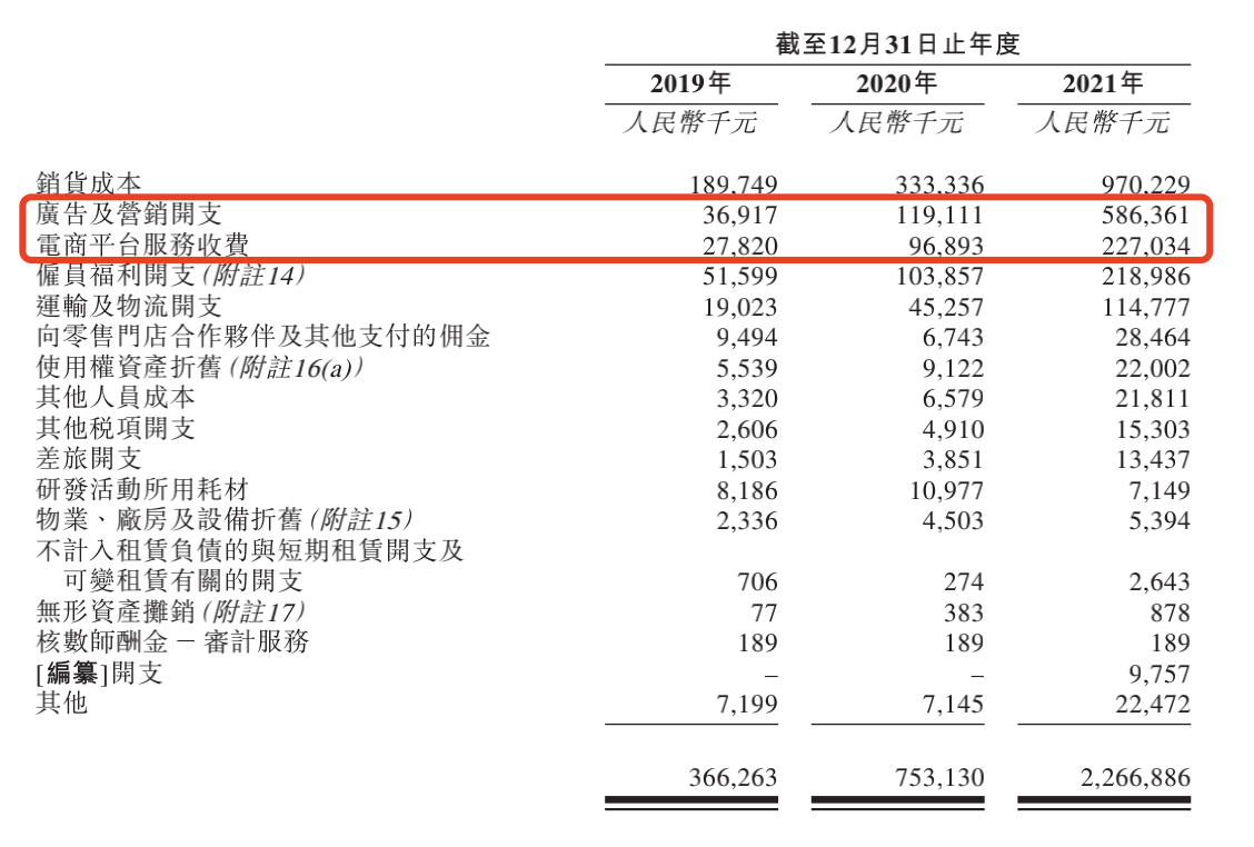 2019年和2020年,蕉下的广告及营销开支分别为3691万元、1.19亿元, 2021年更是暴增392%至5.86亿元,占公司全年收入的四分之一,因其依赖营销驱动的天猫、京东及抖音等电商平台,电商平台服务收费开支也达到了2.27亿元。