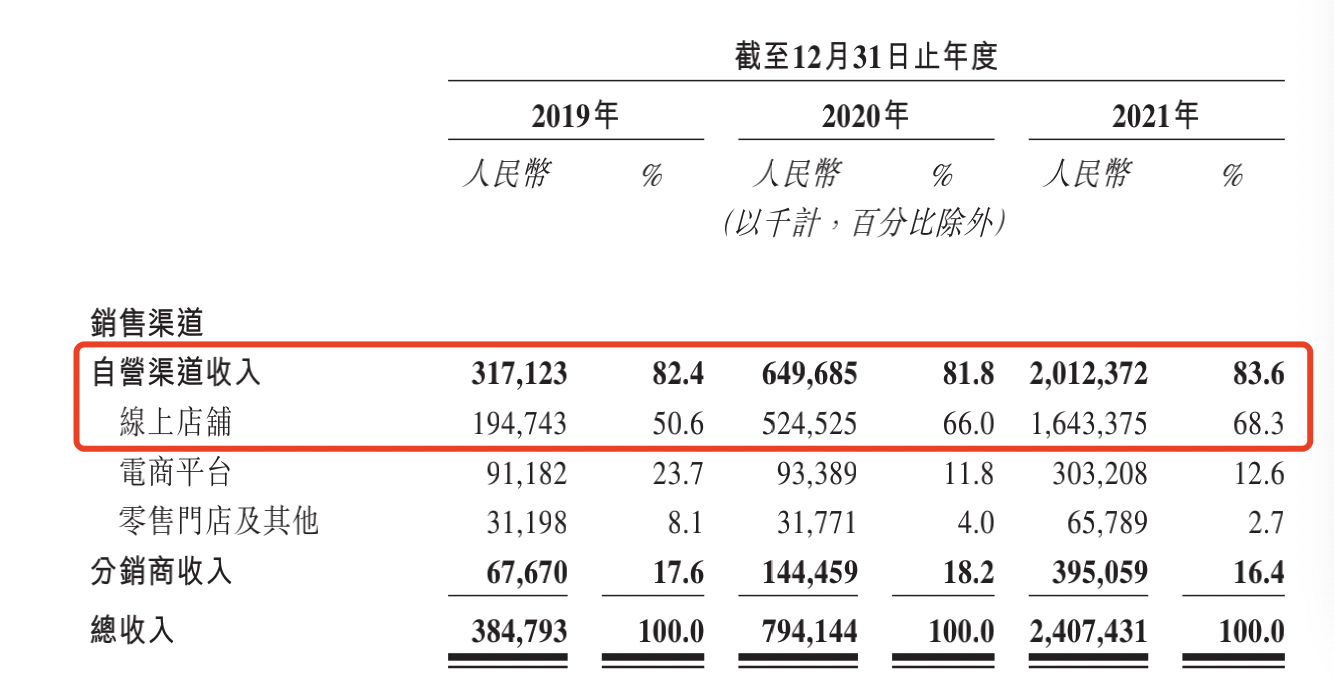 招股书披露,蕉下的DTC渠道采用自营渠道和分销商相结合的销售模式。其中,自营渠道是主要营收渠道,包括通过在线店铺销售、向电商平台销售和线下零售门店销售。 从2019年到2021年,蕉下仅在线渠道的收入就由人民币2.859亿元、6.179亿元、增至19.466亿元,年复合增长率为160.9%。