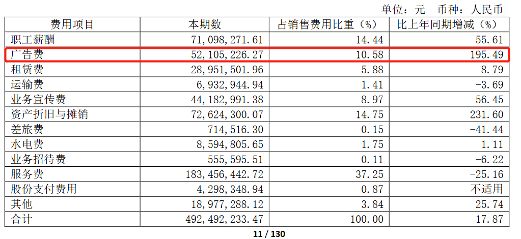 其次,公司实施品牌战略升级,在广告投放、业务宣传、形象升级方面的投入增加较多。