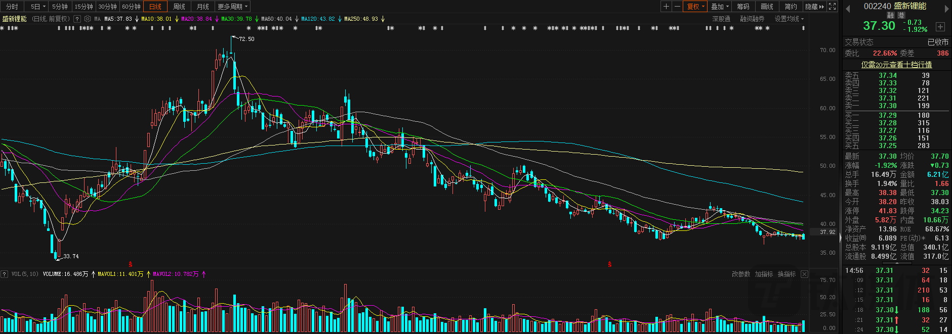 业绩公告发布后,盛新锂能当天股价高开低走,截至3月7日收盘,跌幅1.92%,报于37.3元/股,总市值340亿元。值得注意的是,目前的股价对比自2022年7月创下72.5元高点的股价已然近腰斩。