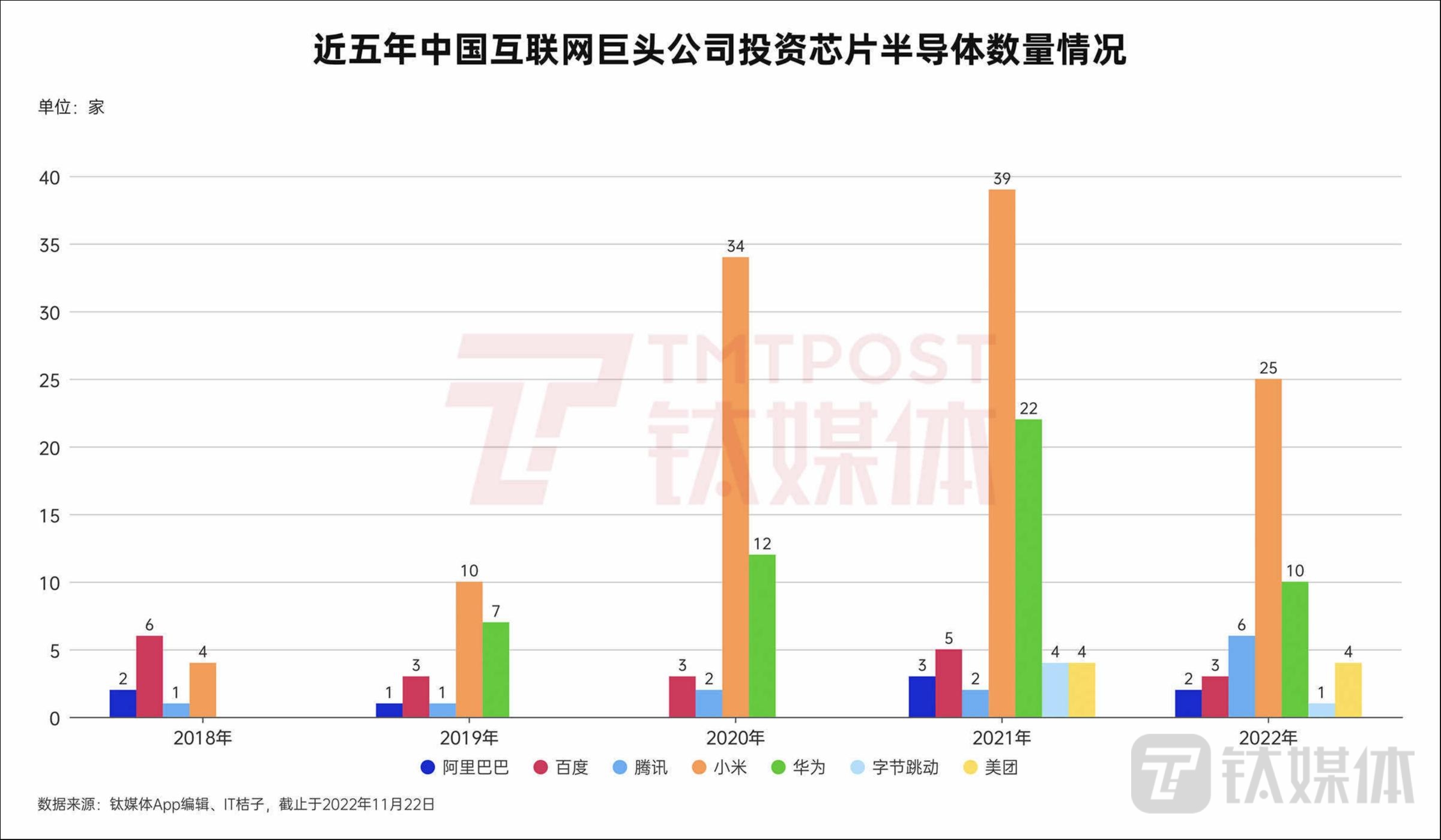 根据IT桔子数据显示,自2018年以来,阿里、腾讯、百度、小米、华为、美团、字节跳动七大互联网企业对芯片半导体整体投资数量不断增长,并在2021年投资总量达到顶峰,至79起。值得注意的是,美团和字节跳动是最近两年才开始关注芯片半导体领域投资,并在2021年开始布局。