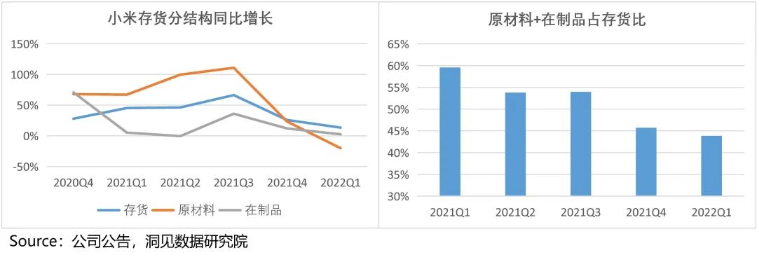 这在数据上也有一定印证。如下图,2021Q3之后,小米原材料和在产品的同比增速持续下滑,同时占存货比,也在不断压缩。