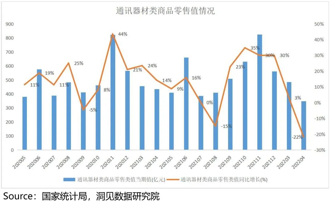 一方面,行业出货量的大幅下降,对独立手机厂商的影响是决定性的,大大超过竞争因素的影响。如下图,2022Q1整体的通讯器材类零售值,进一步同比大幅下滑,经济依然在下行探底。