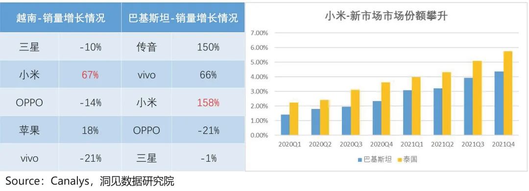 其中,在一些新市场,比如越南、巴基斯坦,小米的出货量增长,大幅领先行业;同时,在泰国、巴基斯坦,小米的份额持续增长。