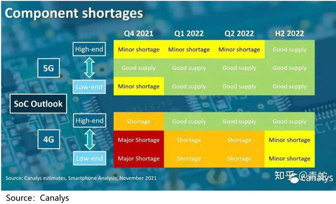 比如,Canalys报告显示,2021Q4中低端4G芯片均进入“major shortage”,紧缺程度远胜5G芯片。
