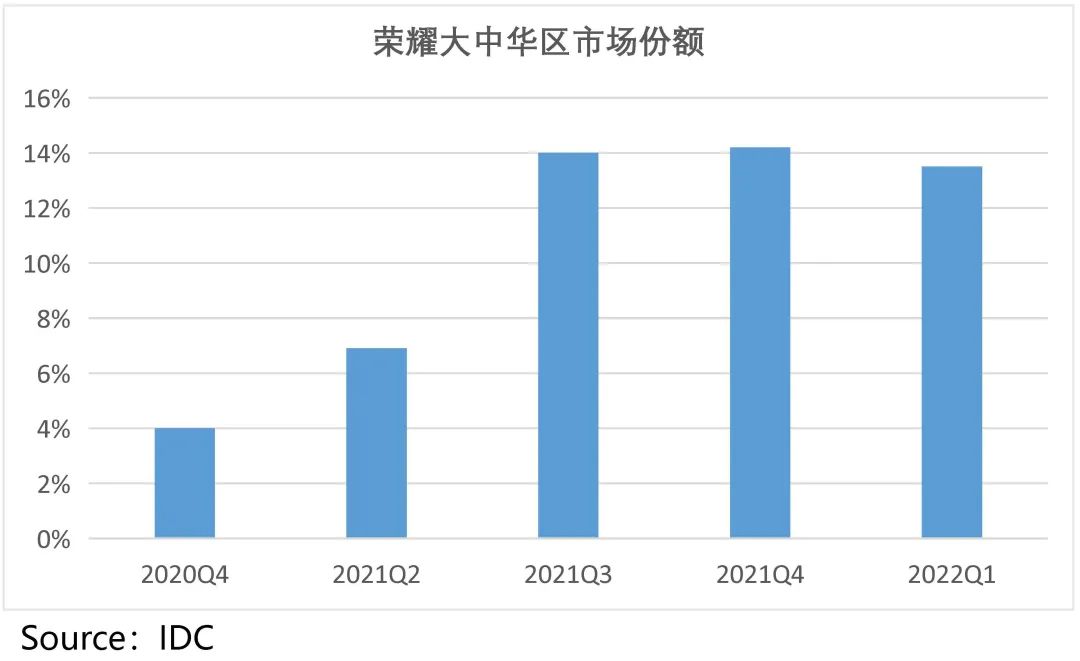 “荣耀自2021年下半年回归以来,表现持续超预期,市占率基本稳定在15-20%。2022年是其关键之年,团队和股东的战斗力都不容轻视。因此,短期可以预料,小米将面临荣耀的顽强崛起。”