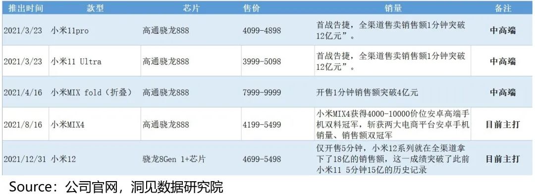 也就是,提升高端机的销量,补齐产品生态,提振收入,具体举措有:2021年,小米陆续推出了5款中高端机型。