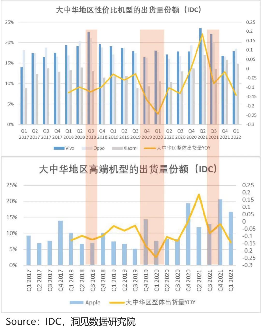 以手机行业来说,经济运行周期中,高端机型和大众市场机型呈现出“大部分独立增长,少量重合部分此消彼长”的结构性增长规律。而每次手机总出货量低谷期,大众市场机型份额提升;高端机则相反,出货量份额下降。