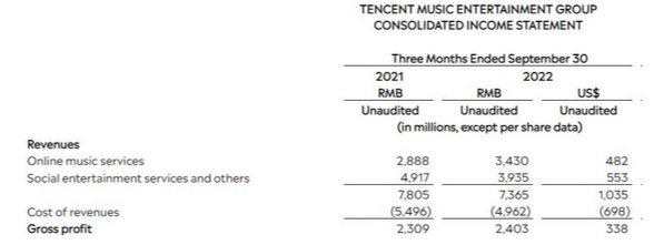 即使如此,在腾讯披露的财报中,广告营收的占比也在稳步提升,根据2022财年第三季度的腾讯音乐娱乐集团财报来看,其在线音乐服务的收入为34.3亿元,同比增长18.8%。