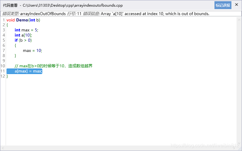 [/usr/TscanCode/samples/cpp/arrayIndexCheckDefect.cpp:10]: (Critical) Array buf[10] is accessed at index [i] may out of bound, as the index range check defect at line 6 may be wrong, mind the boundary value.