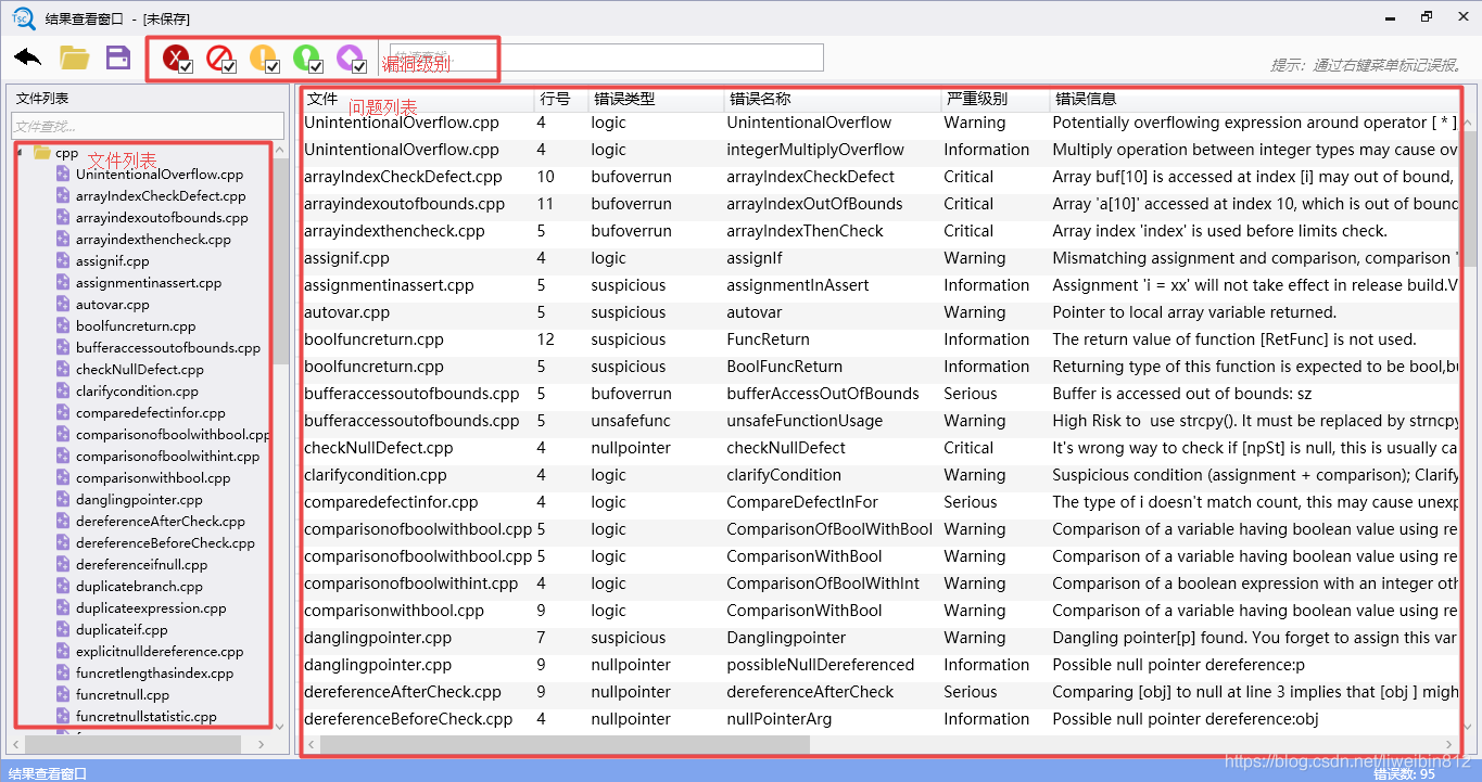 - 运算错误,判断无符号数小于0,对bool类型进行++自增等,共计11类检查。