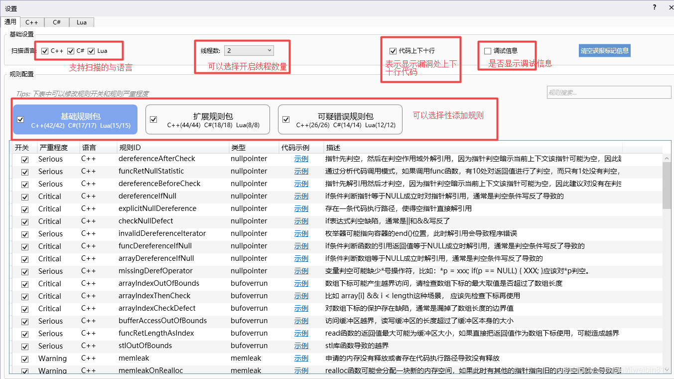 - 规则定义: 1. error:出现的错误2. warning:为了预防bug防御性编程建议信息3. style:编码格式问题(没有使用的函数、多余的代码等)4. portablity:移植性警告。该部分如果移植到其他平台上,可能出现兼容性问题5. performance:建议优化该部分代码的性能6. information:一些有趣的信息,可以忽略不看的。
