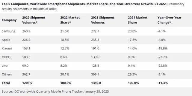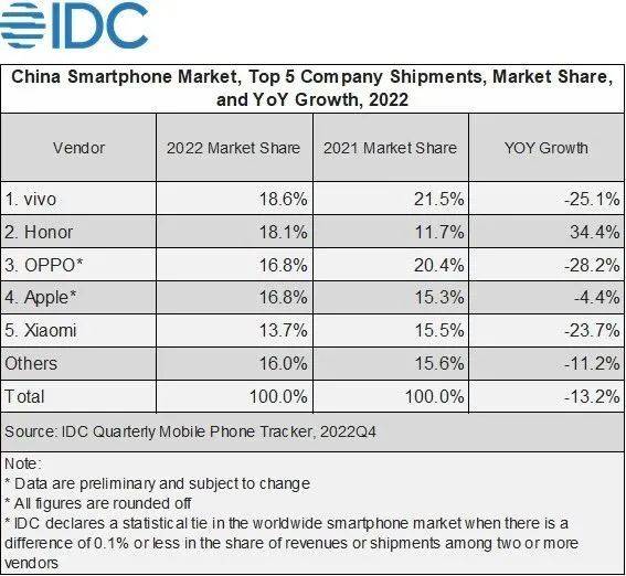 不只小米,除了荣耀之外,多个国内厂商2022年出货量下滑幅度均超过20%以上。