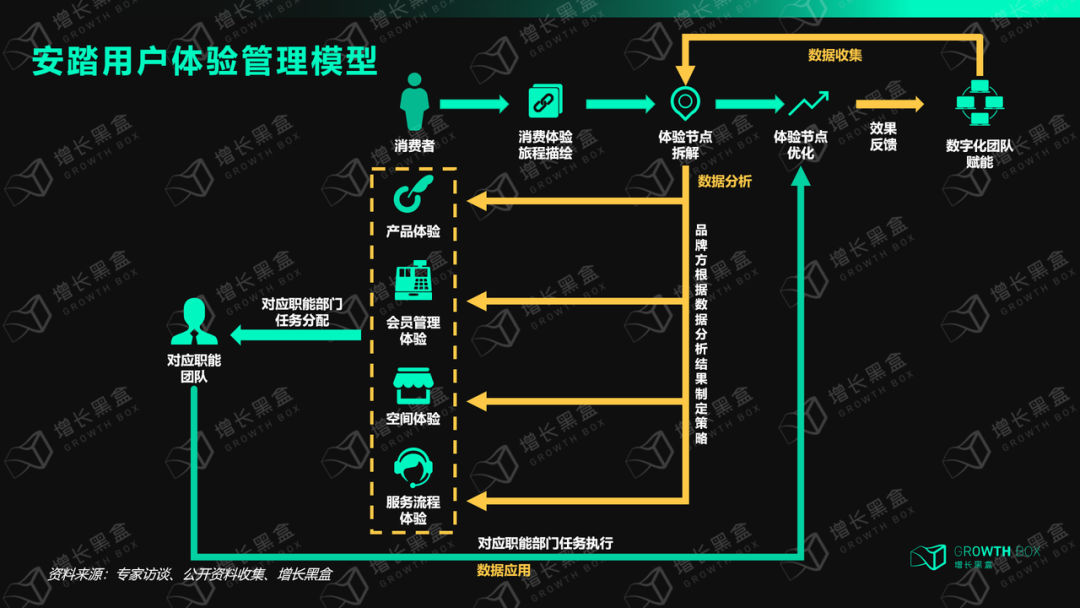 - 优化效果反馈与二次迭代:当职能团队完成体验节点优化过程后,消费者的相关行为数据与消费数据将会由在拆解过程中所设置的相关数据监测触点进行捕捉,并反馈至数字化团队,后者根据所反馈数据对消费升级策略进行二次调整,并开启第二次迭代升级循环。