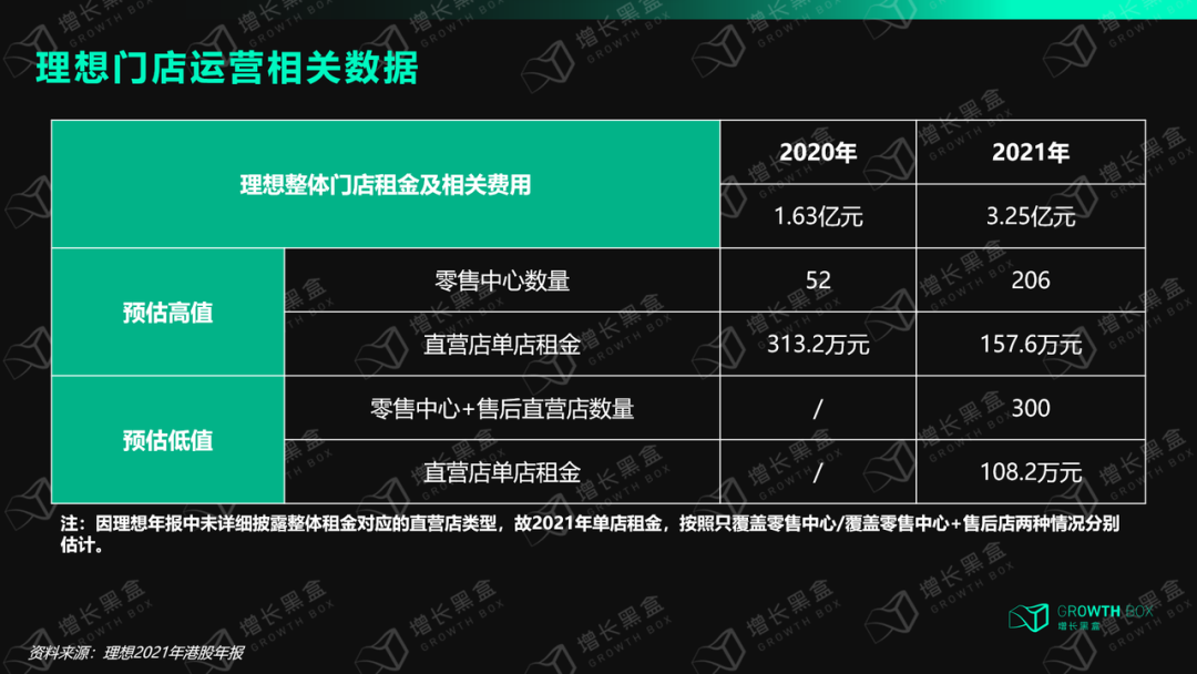 大家都会潜意识认为开直营门店成本巨大,特别是直营商超店房租较高。但实际上,理想汽车单店年度租金在108-158万元,房租并没有很贵。具体来看,2020年直营店单店房租313万元左右,因初期渠道布局主要集中在一线城市,普遍房租较高;而到了2021年,理想零售中心这类商超店从52家增加到206家,尽管数量增长,但由于渠道开始下沉,低线城市的房租不高,拉低了平均房租。