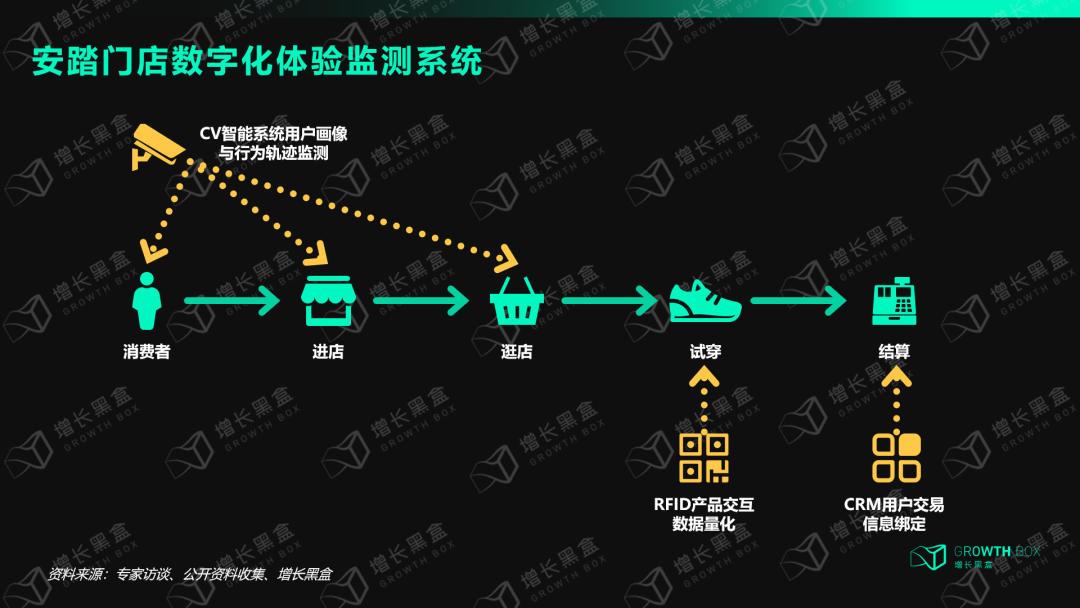 安踏线下门店根据用户体验旅程,从消费者进店→逛店→试穿→结算等触点进行全链路监测,以此来细化数据颗粒度,精准量化消费者行为数据,指导门店运营布局快速调整,提升门店经营效率。