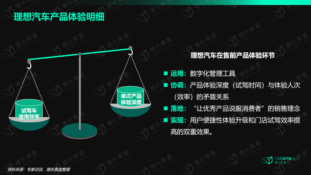 增长黑盒了解到,理想在售前环节提升产品体验的主要策略,是希望用户与产品多交互、深度试驾,尽可能拉长消费者单次试驾的时间和里程(例如某一区域对于单次试驾的最佳标准是1小时/20公里)。