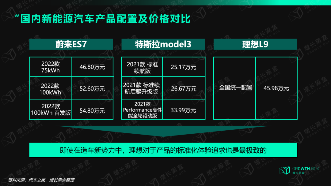 不同于其他造车新势力,理想只有一款产品,且全国统一配置。为用户提供了极致的产品选择。另外,在价格策略上,理想汽车的价格线上线下统一、各地各店统一,产品配置统一,即使在造车新势力中,理想对于产品的标准化体验追求也是最极致的。