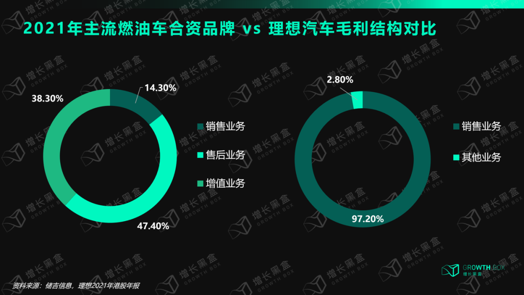 我们查阅了汽车行业相关报告,数据显示2022年2月,主流合资品牌的业务中,售后业务毛利占近50%,远高于卖车产生的毛利;反观理想2021年底的最新财报,几乎所有利润都来自销售新车。