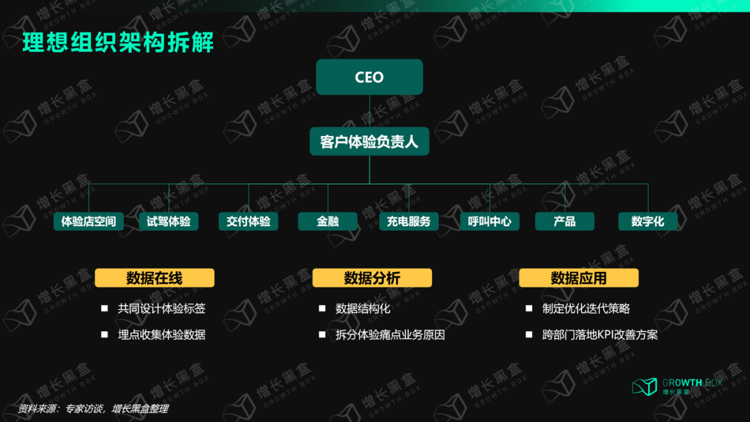 与前面所拆解的案例不太一样,新能源汽车行业为了提升用户体验更加注重打造去中心化业务流程布局。汽车新锐品牌往往在总部层面设立客户体验部门/负责人,将客户体验管理上升到企业战略层面。