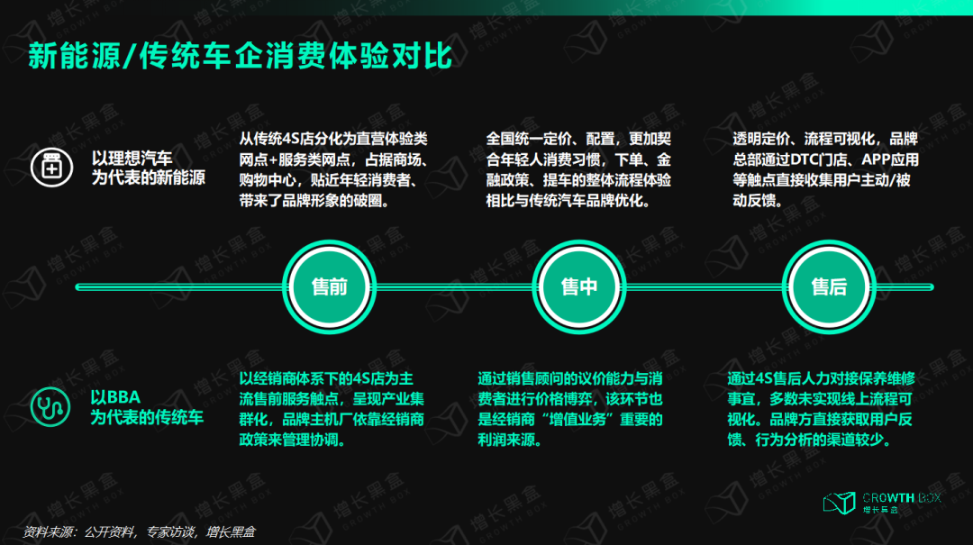 在业务架构扁平化处理之后,新锐电动车品牌是如何做好用户体验的提升呢?增长黑盒研究发现,新锐电动车品牌在售前、售中、售后三大流程对于用户体验的管理,与传统车企形成了较为明显的对比,具体大家可以参考下图: