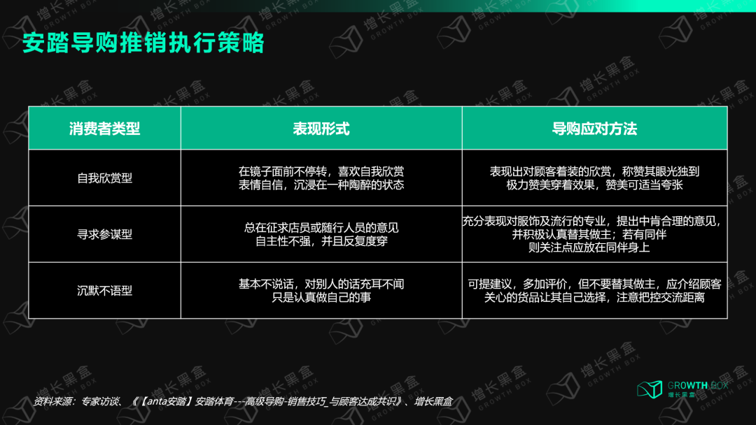 与大多数服装品牌一样,安踏将导购人员转型为服装咨询顾问,会针对不同客群灵活调整SOP推销话术,给予消费者合适服务距离,具体执行策略可参考下图。[2]