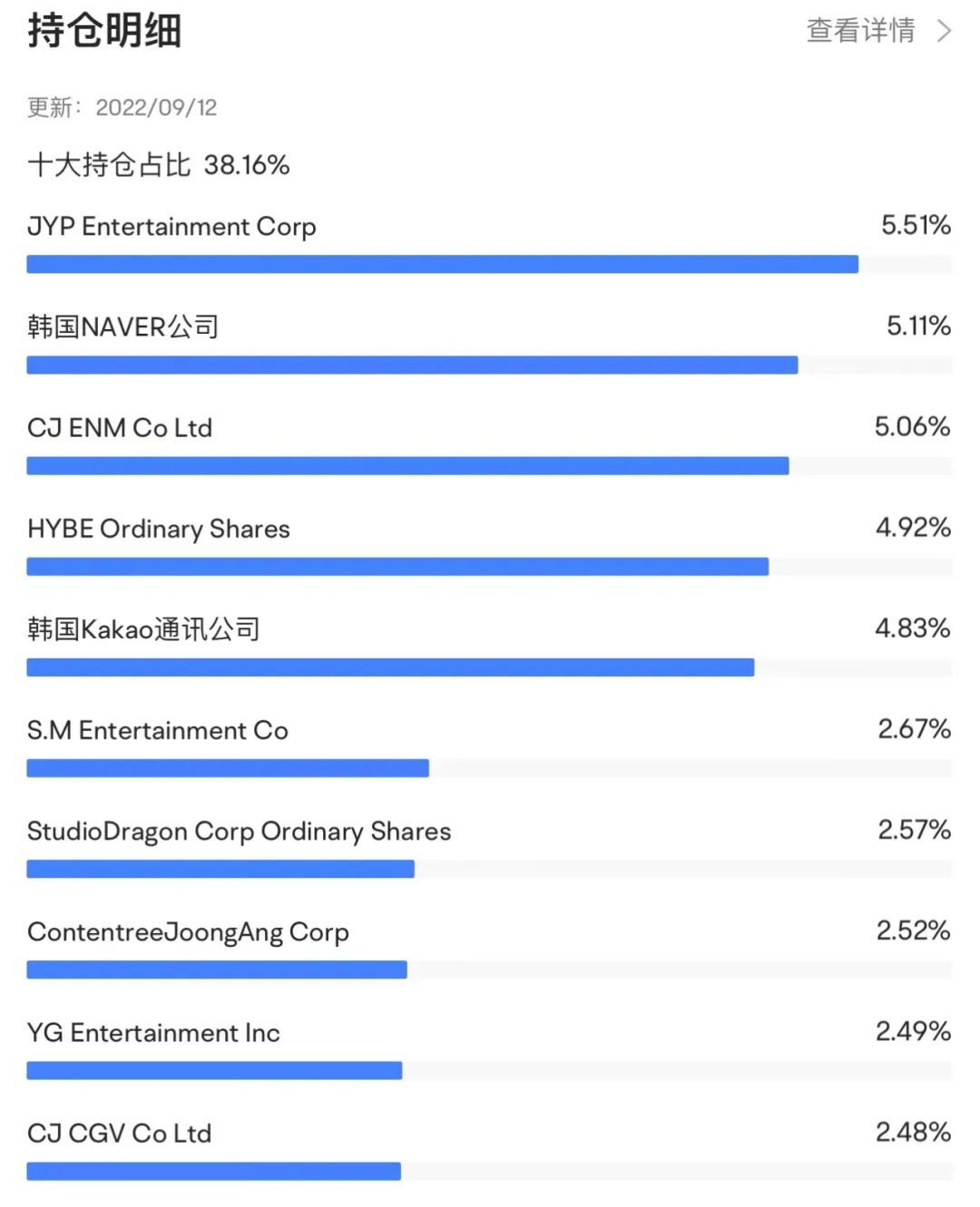 考虑偶像依赖因素,对比9月12日与9月1日的持仓情况会发现,前五位持仓量从首发时约占一半到目前的25%,KPOP ETF在各家持仓的比例更加均衡,也意味着不在头部公司押重注。