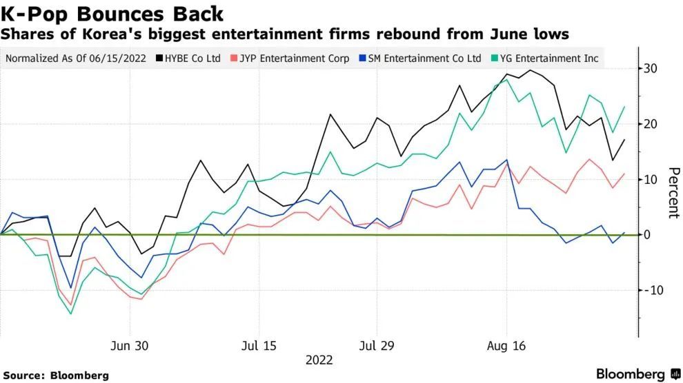 在全球市场低迷的情况下,HYBE集团、YG娱乐等股价也从6月的低点持续上涨,反弹约20%左右。以JYP娱乐为例,TWICE成员林娜琏在6月24日以Solo歌手身份出道后,带动JYP股价上涨9.17%;而旗下TWICE在7月13日宣布全员续约后,股价也曾涨至2.29%。