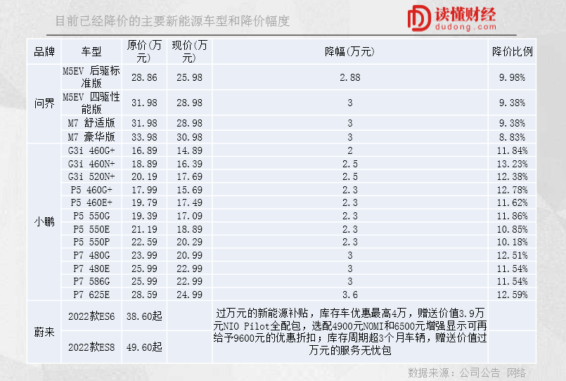1,特斯拉Model 3和Model Y降价3-4万后,订单速度几乎是生产速度的两倍。在特斯拉带动下,问界、小鹏也针对老车型或销售不佳的车型进行了一定降价,降价幅度在8%-14%之间。蔚来此次降价同样针对老款库存车型,但综合降幅更高,在20%-25%左右。