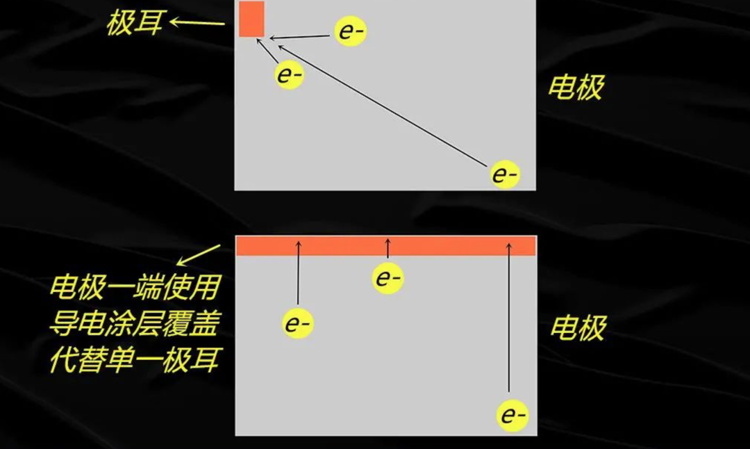 通俗点说,就是由点对点传输变成了面对面传输,电子传导面积变大,传输效率变高,避免了极耳过电位的产生,降低热量聚集。